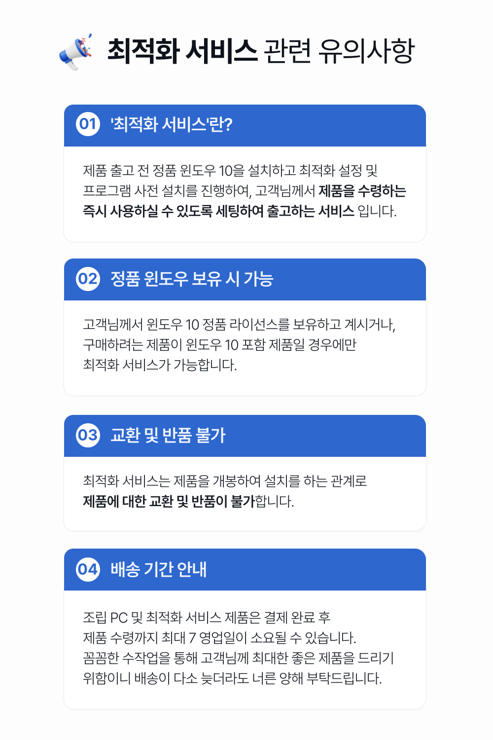 특수 제품의 배송 최대 7 영업일 소요 예정 (조립PC 및 최적화 서비스 포함 제품 등)